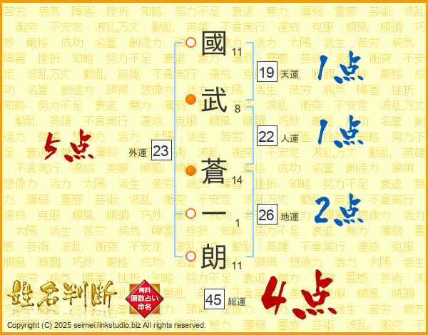 國(11画)武(8画) 蒼(14画)一(1画)朗(11画)