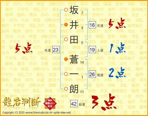 坂(7画)井(4画)田(5画) 蒼(14画)一(1画)朗(11画)
