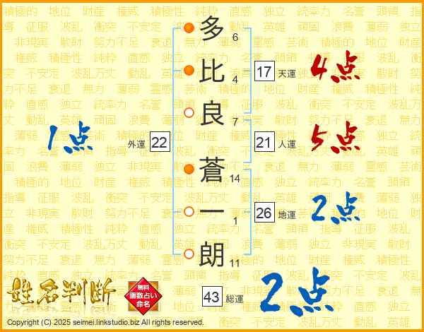 多比良蒼一朗さんの総運は43画の2点!