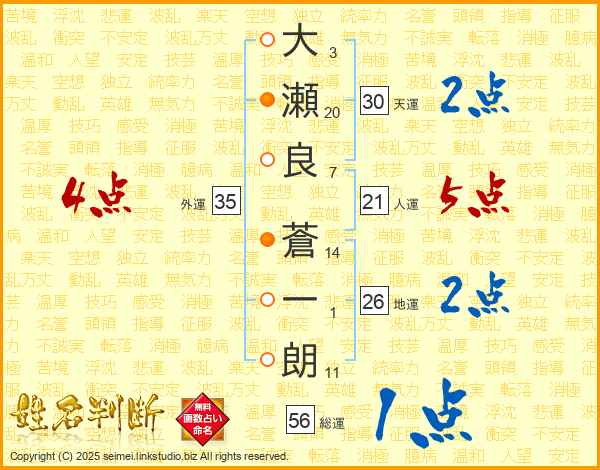 大(3画)瀬(20画)良(7画) 蒼(14画)一(1画)朗(11画)