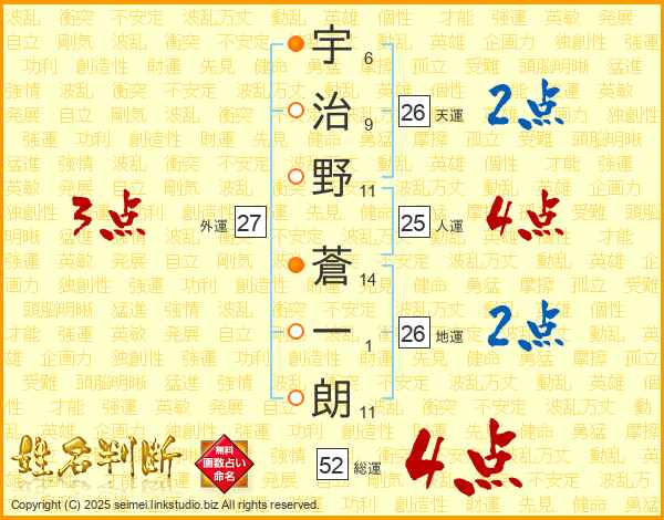 宇(6画)治(9画)野(11画) 蒼(14画)一(1画)朗(11画)