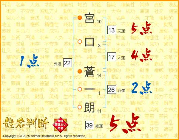 宮口蒼一朗さんの総運は39画の5点!