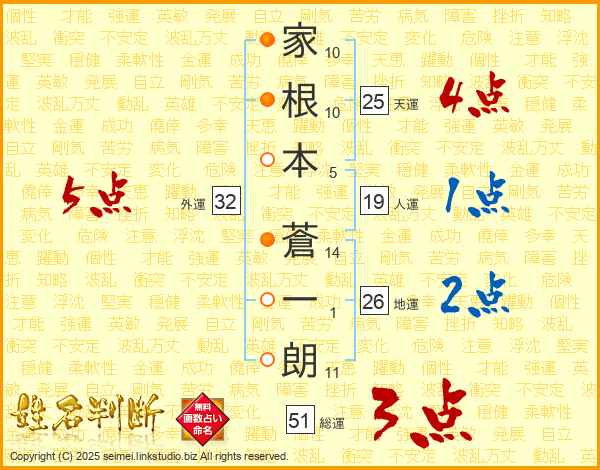 家(10画)根(10画)本(5画) 蒼(14画)一(1画)朗(11画)