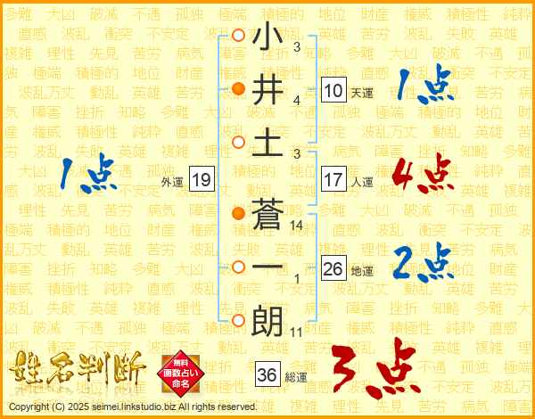 小(3画)井(4画)土(3画) 蒼(14画)一(1画)朗(11画)