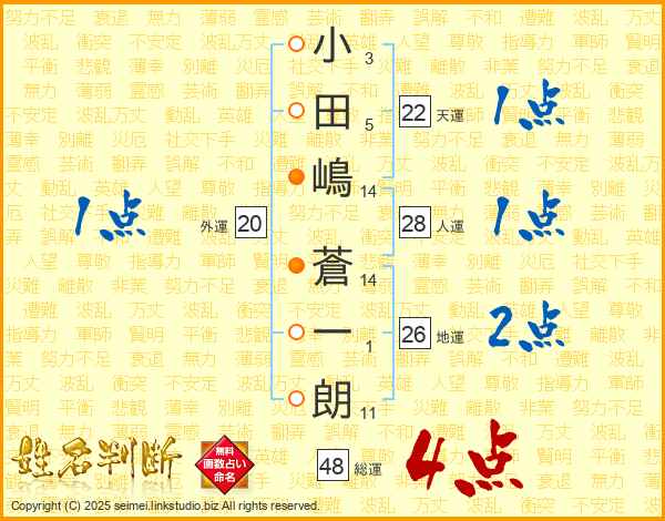 小(3画)田(5画)嶋(14画) 蒼(14画)一(1画)朗(11画)