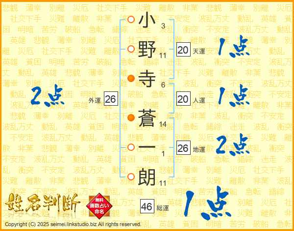 小(3画)野(11画)寺(6画) 蒼(14画)一(1画)朗(11画)
