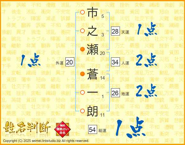 市(5画)之(3画)瀬(20画) 蒼(14画)一(1画)朗(11画)