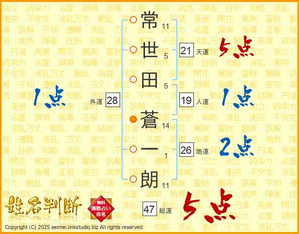 常(11画)世(5画)田(5画) 蒼(14画)一(1画)朗(11画)