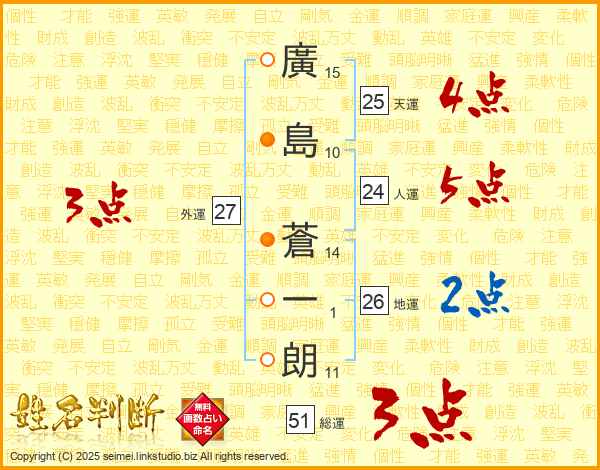 廣(15画)島(10画) 蒼(14画)一(1画)朗(11画)