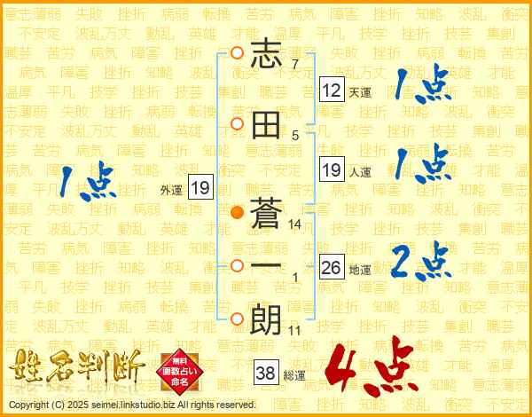 志(7画)田(5画) 蒼(14画)一(1画)朗(11画)