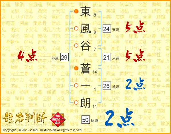 東(8画)風(9画)谷(7画) 蒼(14画)一(1画)朗(11画)