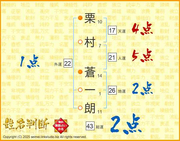 栗(10画)村(7画) 蒼(14画)一(1画)朗(11画)
