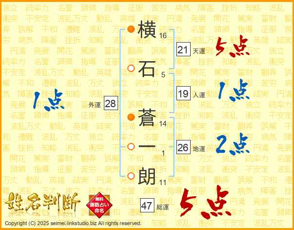 横(16画)石(5画) 蒼(14画)一(1画)朗(11画)