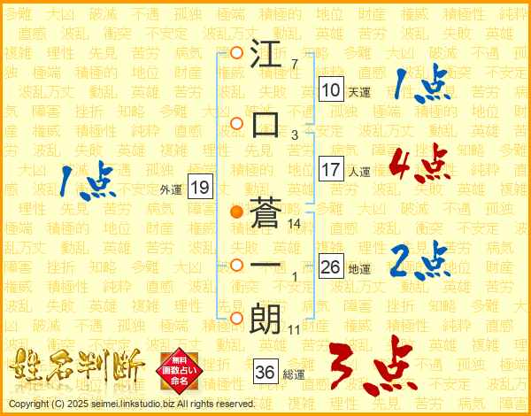 江(7画)口(3画) 蒼(14画)一(1画)朗(11画)