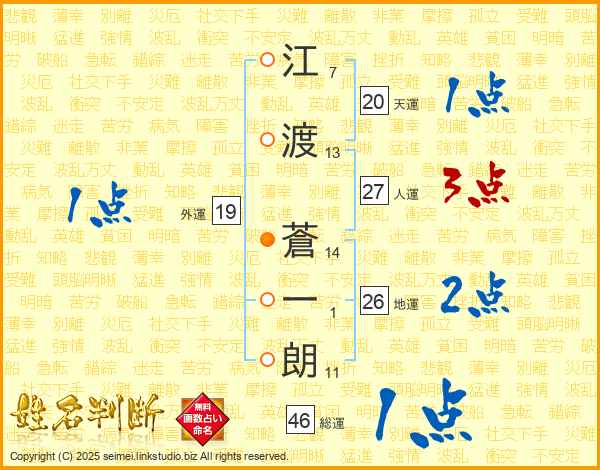 江(7画)渡(13画) 蒼(14画)一(1画)朗(11画)