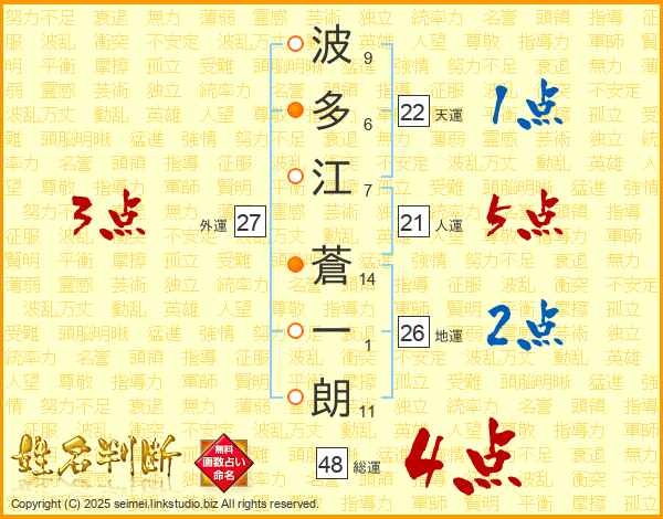 波(9画)多(6画)江(7画) 蒼(14画)一(1画)朗(11画)