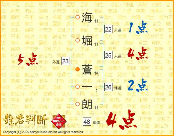 海(11画)堀(11画) 蒼(14画)一(1画)朗(11画)