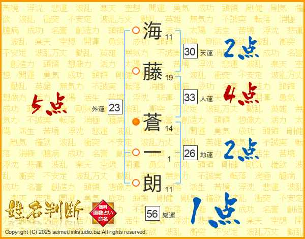 海(11画)藤(19画) 蒼(14画)一(1画)朗(11画)