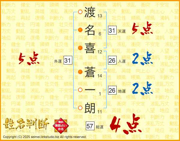 渡(13画)名(6画)喜(12画) 蒼(14画)一(1画)朗(11画)