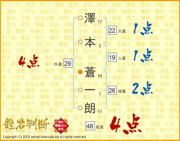 澤(17画)本(5画) 蒼(14画)一(1画)朗(11画)