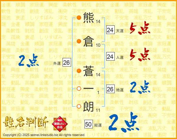 熊(14画)倉(10画) 蒼(14画)一(1画)朗(11画)