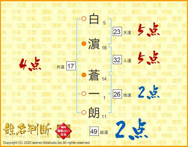 白(5画)濵(18画) 蒼(14画)一(1画)朗(11画)