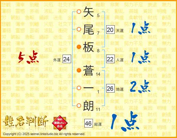 矢(5画)尾(7画)板(8画) 蒼(14画)一(1画)朗(11画)