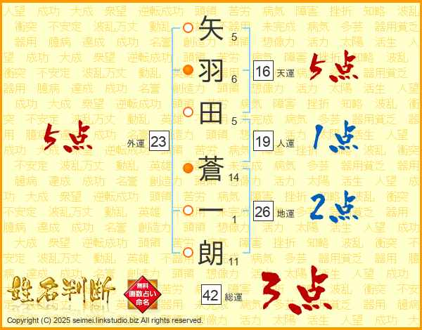 矢(5画)羽(6画)田(5画) 蒼(14画)一(1画)朗(11画)