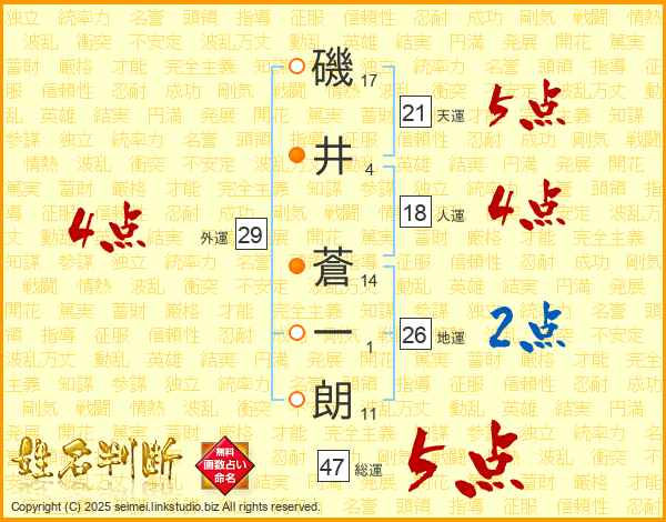 磯(17画)井(4画) 蒼(14画)一(1画)朗(11画)