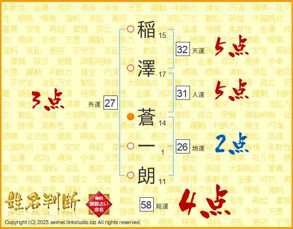 稲(15画)澤(17画) 蒼(14画)一(1画)朗(11画)