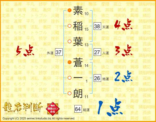 素(10画)稲(15画)葉(13画) 蒼(14画)一(1画)朗(11画)