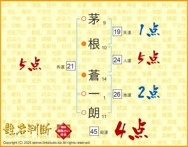 あなたの人生を表す1番重要な運勢です。生涯を通じて影響する総合運となり、主に50歳以降の晩年期に影響を及ぼします。苗字と名前の合計画数。