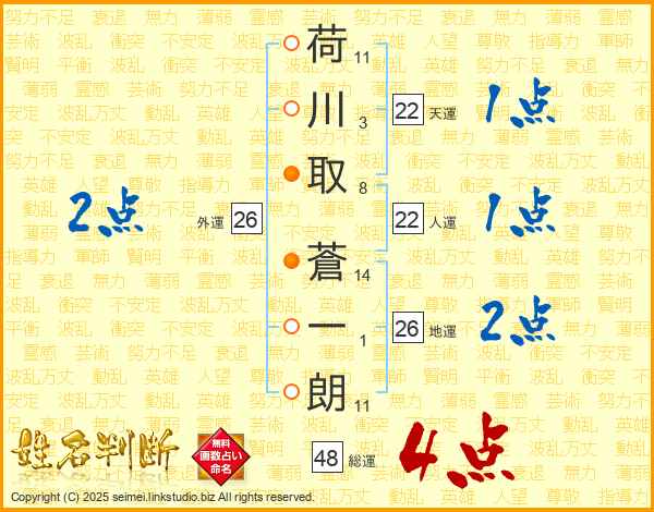 生活面を象徴する運勢です。外部から受ける影響力を表し、結婚運、家庭運や職場、環境への順応性を表します。総運から人運を引いた画数。姓や名が1文字の場合を除く。