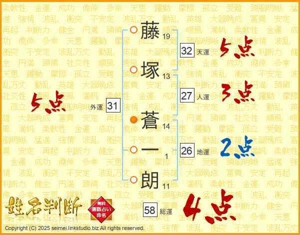 藤(19画)塚(13画) 蒼(14画)一(1画)朗(11画)