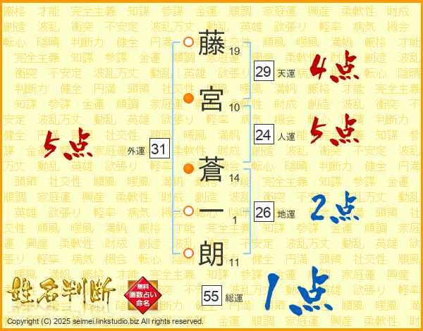 藤(19画)宮(10画) 蒼(14画)一(1画)朗(11画)