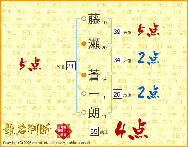 藤(19画)瀬(20画) 蒼(14画)一(1画)朗(11画)