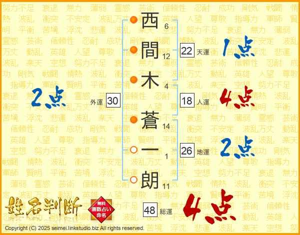 西(6画)間(12画)木(4画) 蒼(14画)一(1画)朗(11画)