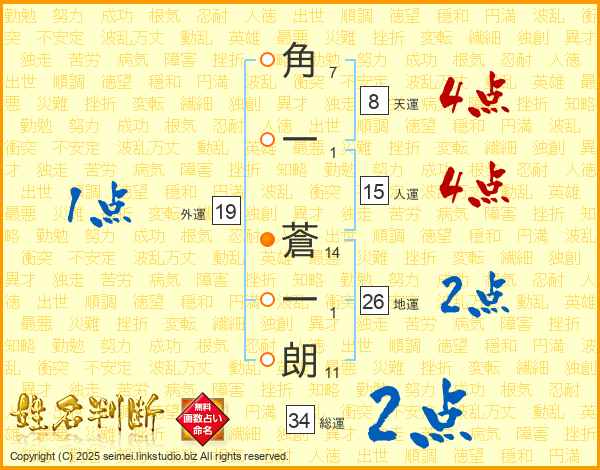 角(7画)一(1画) 蒼(14画)一(1画)朗(11画)