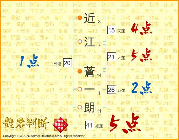 近(8画)江(7画) 蒼(14画)一(1画)朗(11画)