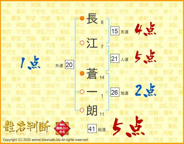 長(8画)江(7画) 蒼(14画)一(1画)朗(11画)