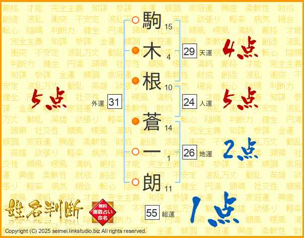 駒(15画)木(4画)根(10画) 蒼(14画)一(1画)朗(11画)