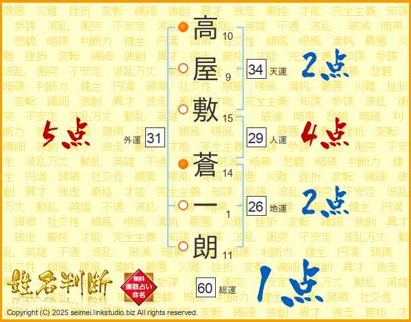 高(10画)屋(9画)敷(15画) 蒼(14画)一(1画)朗(11画)