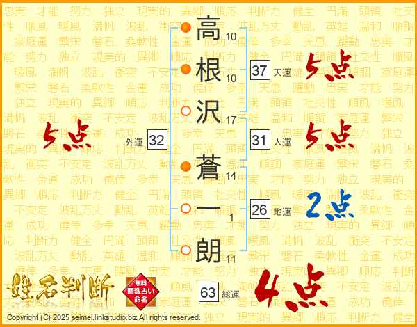 高(10画)根(10画)沢(17画) 蒼(14画)一(1画)朗(11画)