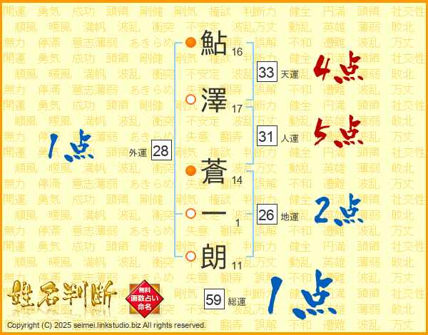 鮎(16画)澤(17画) 蒼(14画)一(1画)朗(11画)