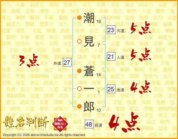 潮(16画)見(7画) 蒼(14画)一(1画)郎(10画)