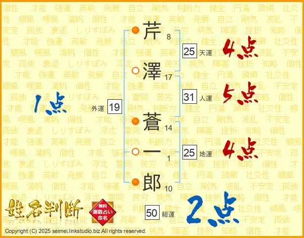 芹(8画)澤(17画) 蒼(14画)一(1画)郎(10画)