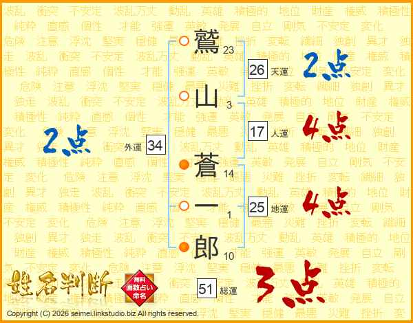 鷲(23画)山(3画) 蒼(14画)一(1画)郎(10画)