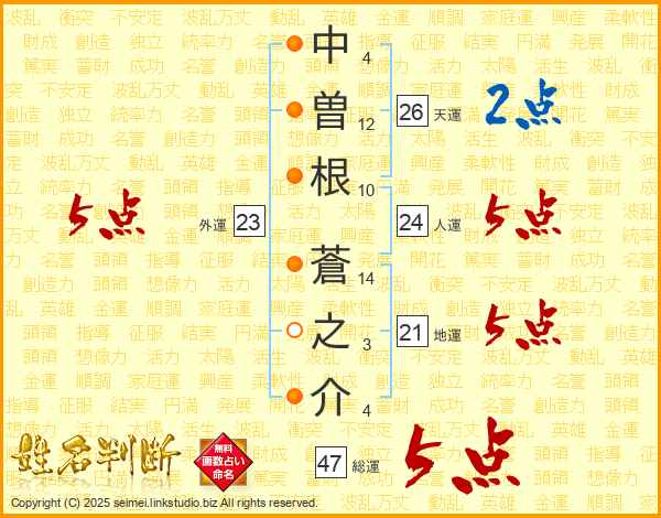 中(4画)曽(12画)根(10画) 蒼(14画)之(3画)介(4画)
