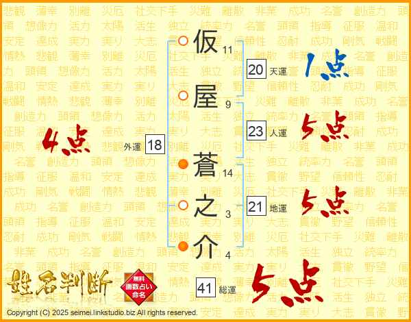 仮(11画)屋(9画) 蒼(14画)之(3画)介(4画)