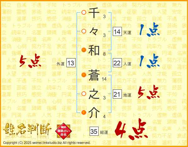 千(3画)々(3画)和(8画) 蒼(14画)之(3画)介(4画)